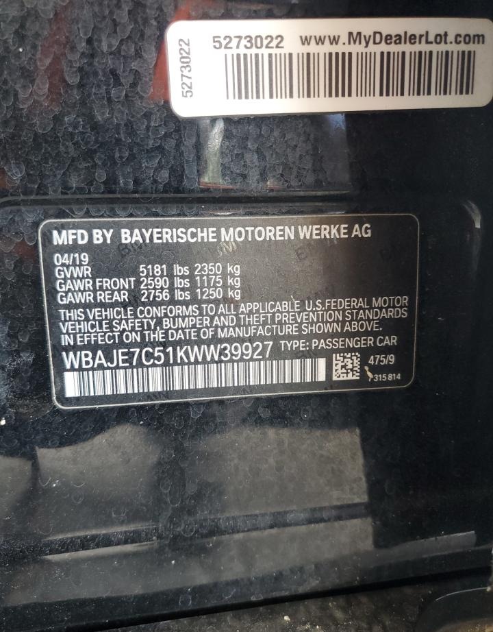 BMW 5 Series 2019 Black 2019 (VIN: WBAJE7C51KWW39927) was sold at an insurance auction on 2024-09-19 as lot 65467794. The vehicle is registered as an automobile by both body type and overall vehicle type and features a Black exterior, automatic transmission and a 3.0l 6 engine, which is a popular configuration for this model year. The listing also notes a Rental Vehicle Sale location in the USA, unknown drive wheel configuration, and the important detail that there were no keys provided with the car at the auction.